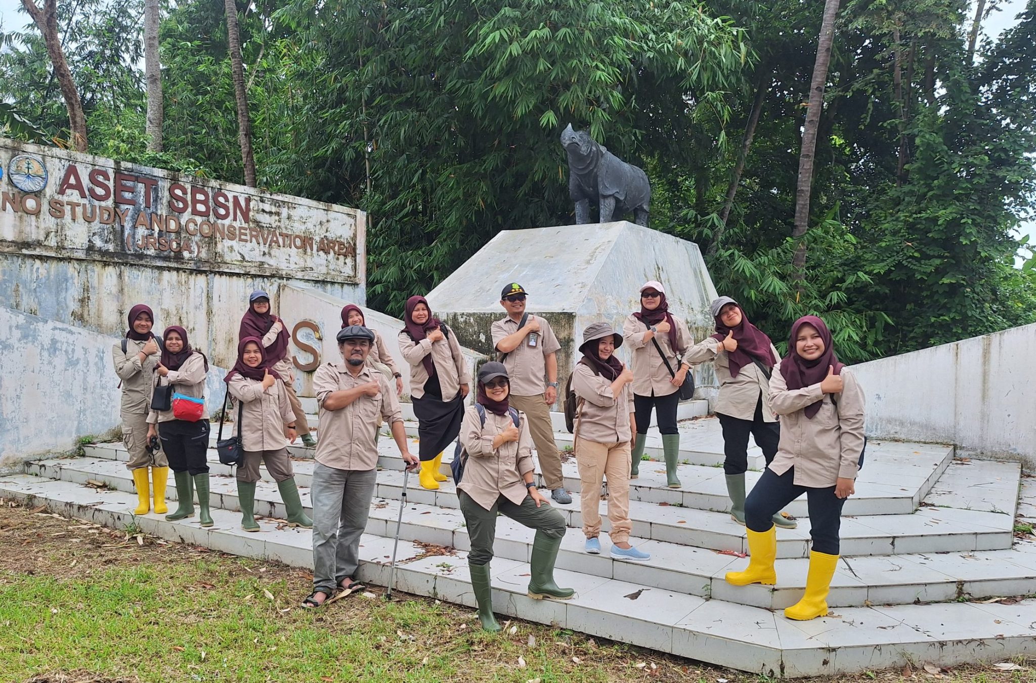 Mahasiswa kemudian mengikuti sesi diskusi mengenai metode penelitian pendugaan populasi badak jawa di Javan Rhino Study and Conservation Area (JRSCA). Materi meliputi penggunaan kamera jebak, analisis tanda keberadaan satwa, dan pendekatan monitoring satwa kunci berbasis sains. Rombongan juga memperoleh informasi terkait Operasi Merah Putih Translokasi Badak Jawa sebagai strategi penyelamatan yang sedang dilakukan oleh TNUK. Kegiatan berlanjut dengan peninjauan fasilitas konservasi badak jawa dan pengamatan owa jawa (Hylobates moloch) melalui perjumpaan langsung maupun identifikasi suara. Pada sore hari, peserta mempelajari pengelolaan ekowisata berkelanjutan di Air Panas Cibiuk, yang menunjukkan integrasi konservasi dengan pemanfaatan jasa lingkungan.