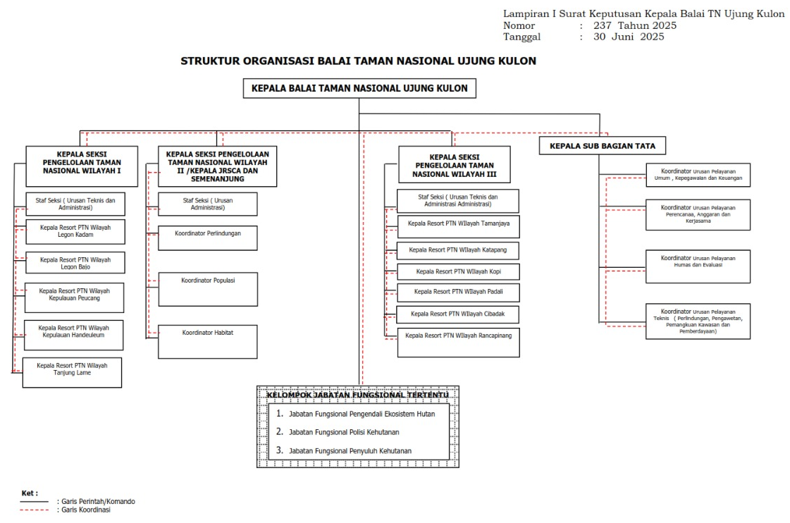 Dalam rangka pelaksanaan tugas pokok dan fungsinya, Balai Taman Nasional Ujung Kulon mempunyai struktur organisasi pelaksana berdasarkan Surat Keputusan Kepala Balai TN Ujung Kulon Nomor 237 Tahun 2025 tanggal 30 Juni 2025,